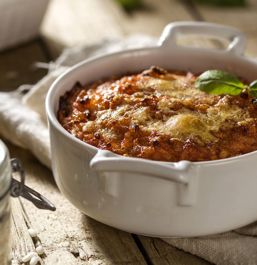 Spread one half of the rice on the bottom of a pan, cover with grated cheese and the cheese cut into cubes and cover with the remaining half of the tomato risotto.