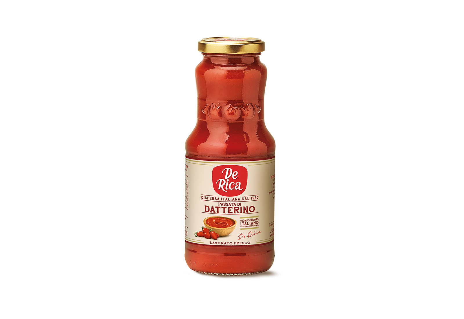 La Passata va così a completare la linea Datterino De Rica, aggiungendosi alle Salsa di Datterino con verdure e alla Salsa Datterino con basilico, caratterizzate entrambe da una lista ingredienti corta e naturale, perfetti per arricchire i migliori piatti della tradizione mediterranea.