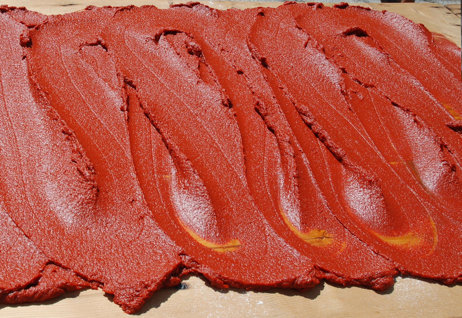 Poi si procede alla seconda fase della lavorazione, riducendo i pomodori in passata per eliminare bucce e semi. C’è chi lo fa cuocendo il pomodoro nei pentoloni, come per la preparazione della passata da imbottigliare, ma anche chi lavora i pomodori esclusivamente a crudo e, dopo averli schiacciati con le mani, lascia che sia il sole a farli lentamente “cuocere”.