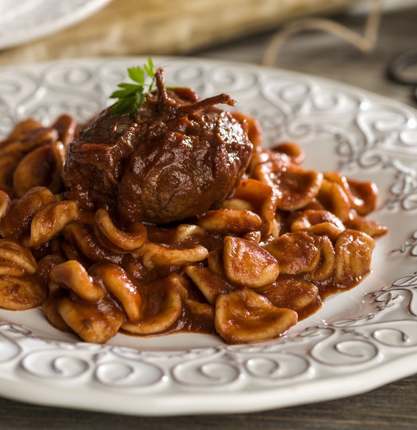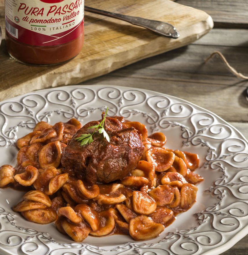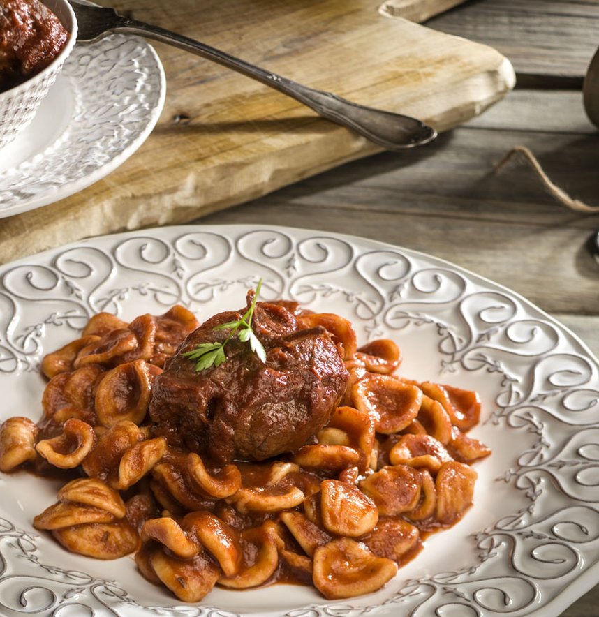 In una pentola capiente mettiamo un fondo d’olio e aglio tagliato grossolanamente (in un secondo momento possiamo anche eliminarlo), adagiamo le brasciole e le facciamo rosolare bene da tutti i lati. Sfumiamo con il vino e aggiungiamo la passata di pomodoro fino a coprirle completamente. Abbassiamo la fiamma, copriamo e lasciamo cuocere per un minimo di 3 ore. Il sugo potrà essere utilizzato per condire le orecchiette che andranno servite insieme alla carne