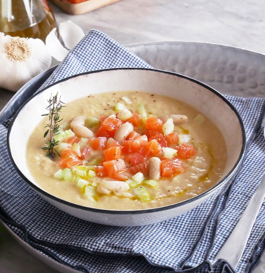 Eliminare le foglie di salvia e mettere i fagioli con il brodo di cottura nel bicchiere di un frullatore. Frullare fino ad ottenere una crema morbida.