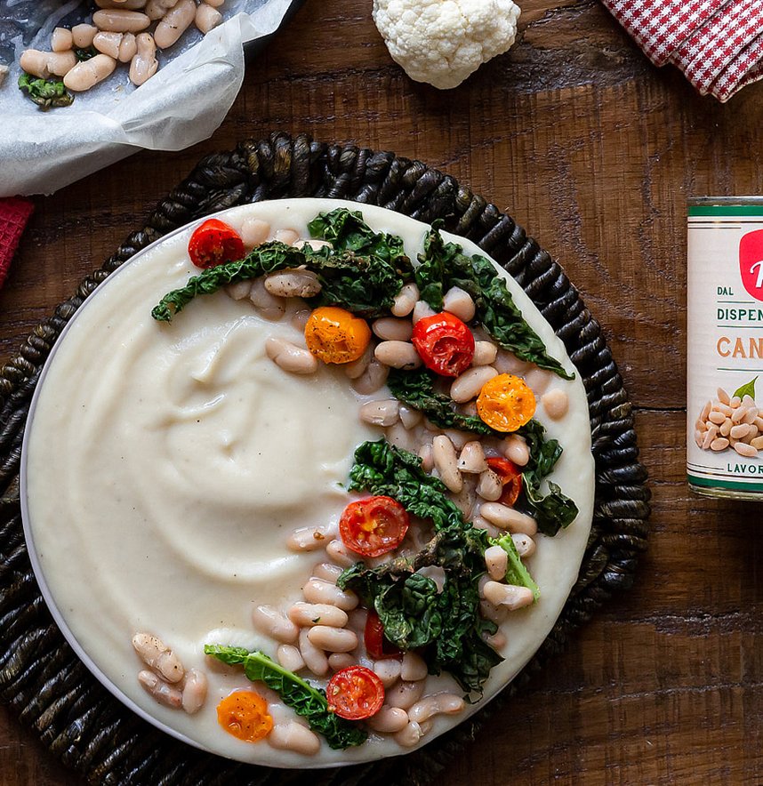 Una crema di cavolfiore vellutata e saporita, accompagnata dai nostri fagioli cannellini, da cavolo nero e pomodorini.