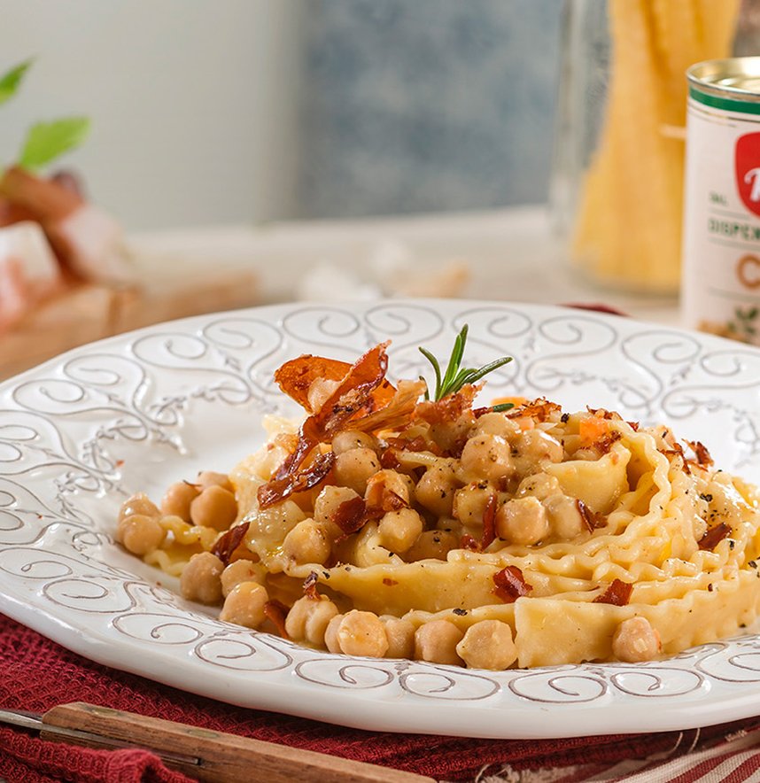Infine impiattate le mafalde, ultimando il piatto con lo speck croccante e un filo d’olio EVO.