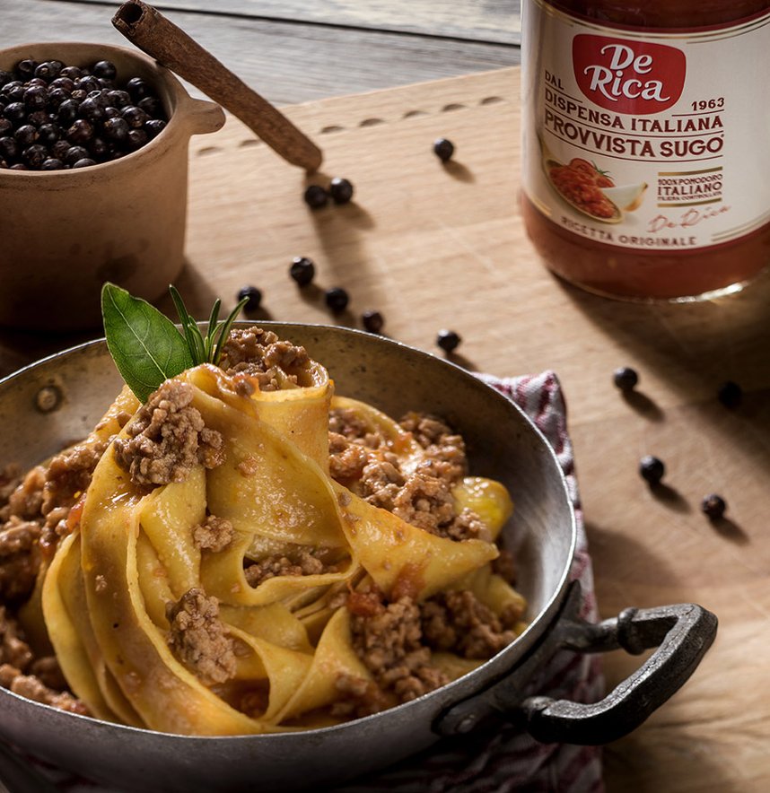 Per prepararle al meglio, bisognerà eseguire una marinatura in modo da aromatizzare la carne di cervo e poi cuocere a fuoco dolce per circa 3 ore. Questo procedimento garantirà un sugo pieno di sapore e profumato con le note di ginepro, rosmarino, alloro e cannella. Per questo piatto la Provvista Sugo De Rica, densa e corposa, rende il ragù di cervo ancora più speciale!