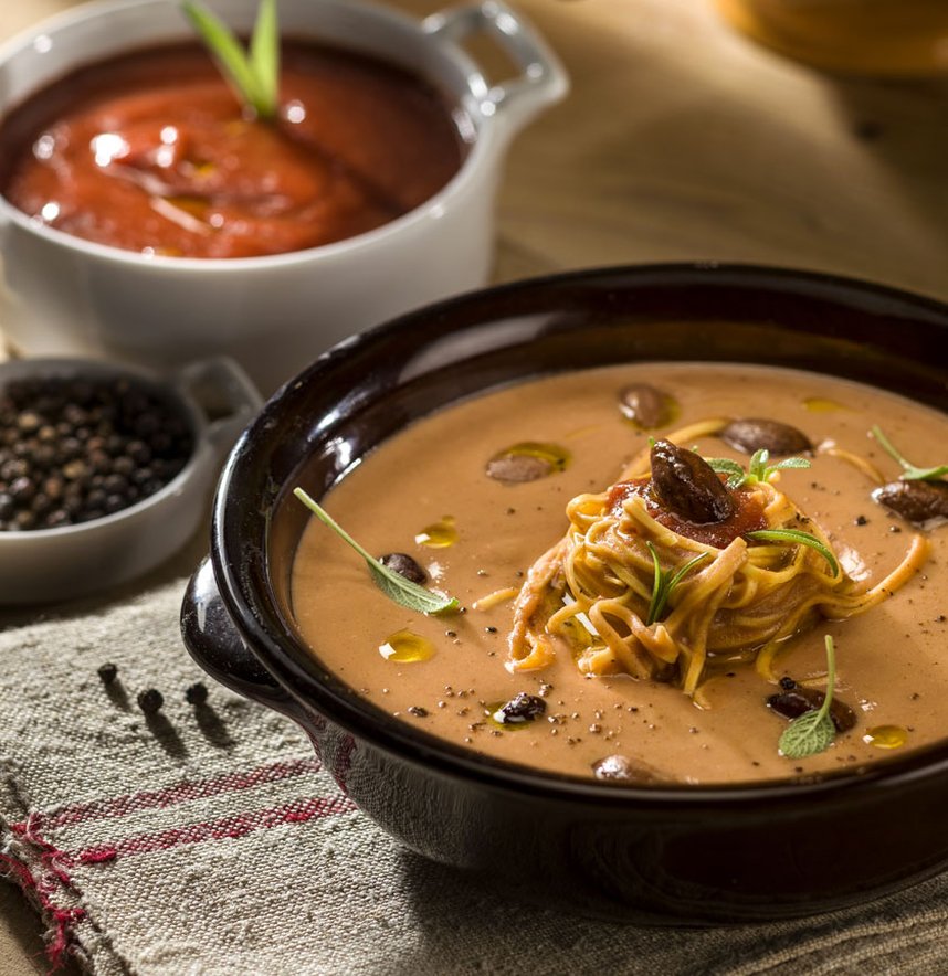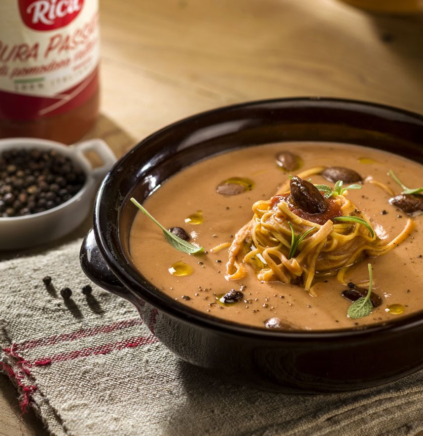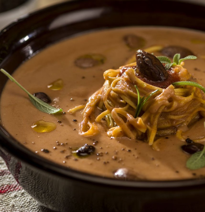 La ricetta tradizionale prevede le cotiche di maiale, mentre questa versione è rivisitata in chiave vegetariana. Le origini della ricetta risalgono al 500, quando si poté finalmente unire alla grande qualità del grano duro italiano, il fagiolo importato da Cristoforo Colombo. La diffusione del fagiolo americano in tutta Italia avvenne in epoca rinascimentale ad opera di Papa Clemente VII, che proprio a Lamon nel bellunese affidò l’incarico della coltivazione ad un sacerdote.