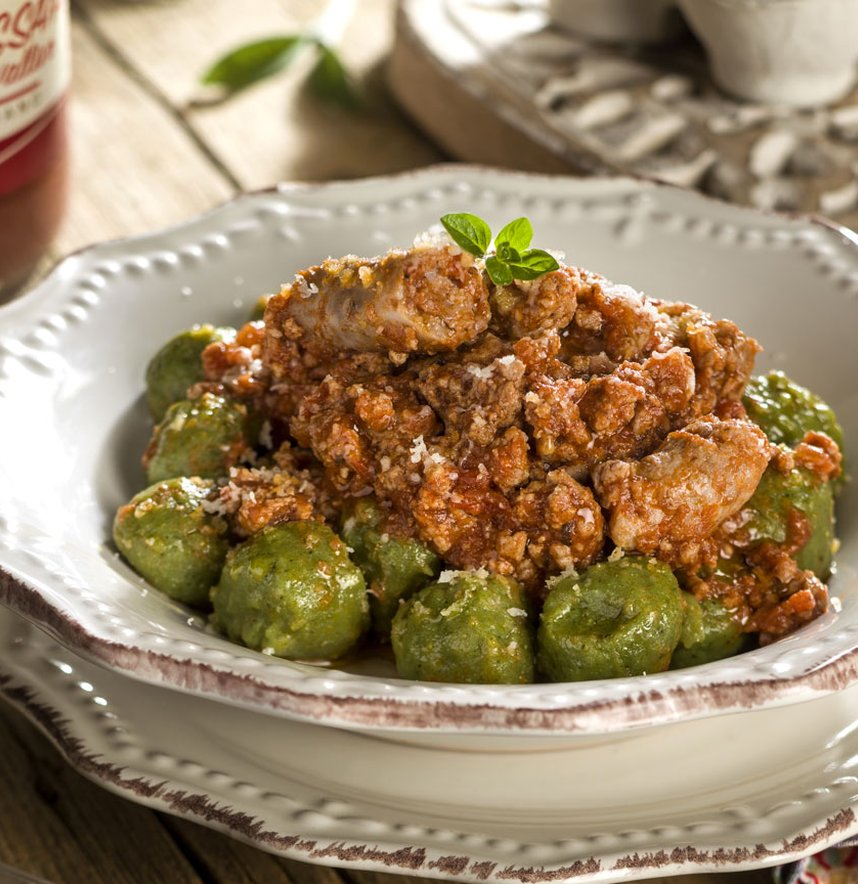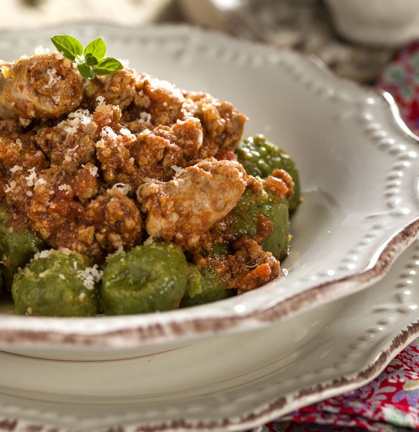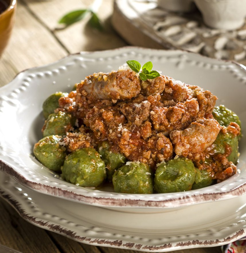 Gli Strangolapreti sono un piatto tipico della cucina trentina: gustosissimi gnocchi di pane, spinaci, uova e grana, generalmente serviti con burro fuso e salvia. Li abbiamo rivisitati abbinandoli al sugo di luganega trentina, la salsiccia fresca di puro suino a grana grossa, base della cucina tipica contadina, diffusissima in tutta la regione insieme allo speck.