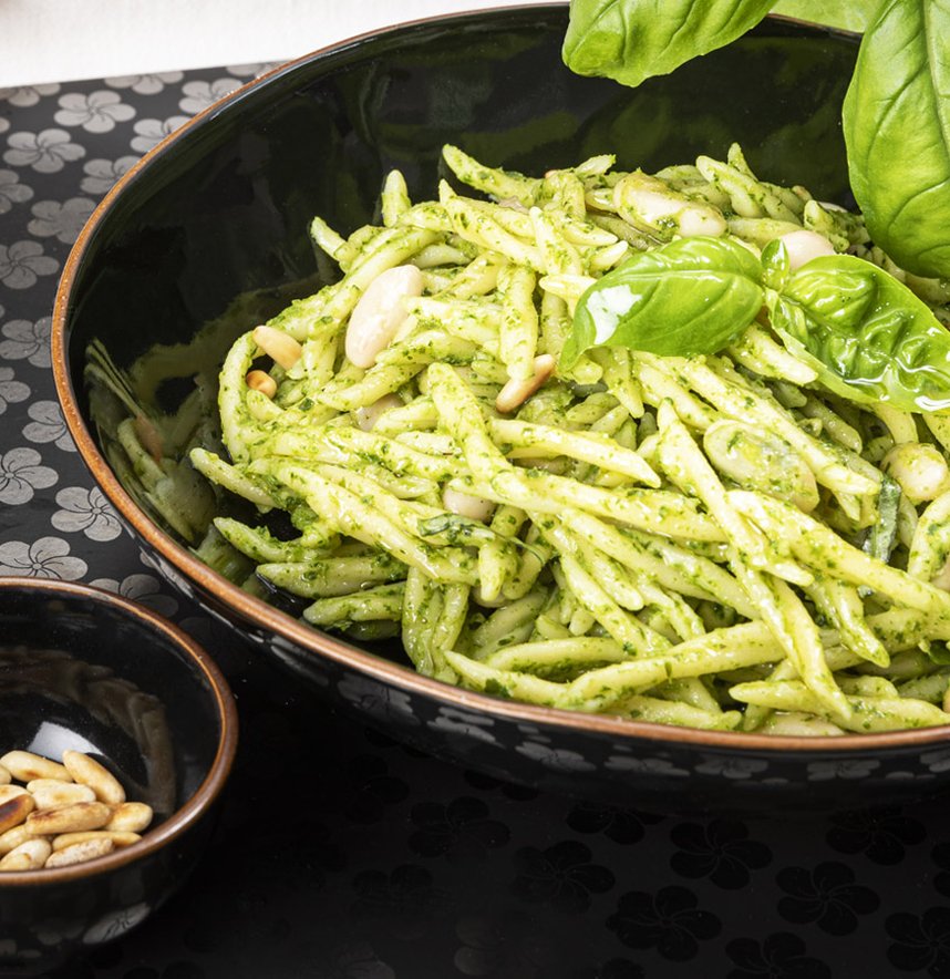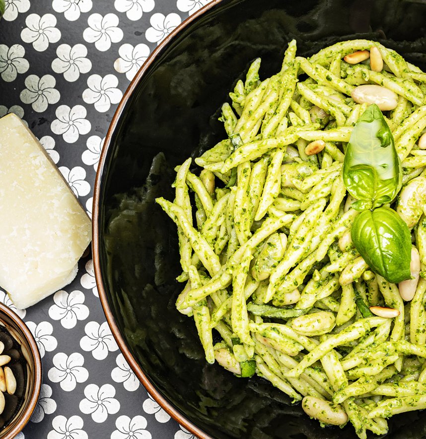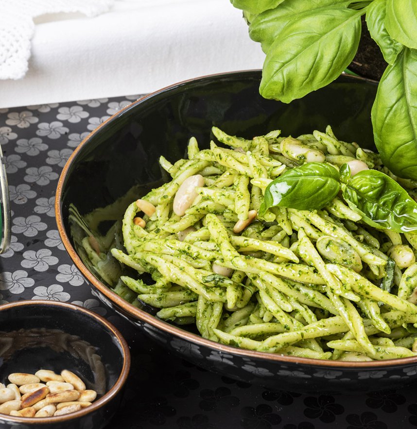 Spegnete la fiamma ed unite il pesto alla genovese. Si formerà una bella cremina! Versate altra acqua, se necessario, ma non accendete il fuoco: il pesto non va cotto. Insaporite le trofie con pesto e fagioli cannellini con un pochino di pepe nero ed impiattate.